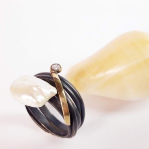 Anell de plata 925 en patina negra i or 18k, porta una perla barroca natural i una zirconita.